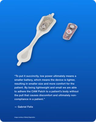 Bardy Diagnostics’ small and lightweight CAM patch is based on the Silicon Lab EFM32 architecture. The patient interface sensor connects to the heart of the system, the EFM32TG210 MCU. This device provides the integrated peripherals (ADC, SPI, ASYNC serial interface and timer functions) and operates with very little power to make the CAM patch effective at “seeing” those minute cardiac details that distinguish the CAM Patch from other available monitors.
