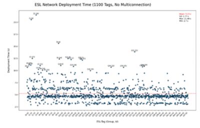 This test covered the ESL network deployment of a network containing 1,100 ESL tags using one AP. For this, we used our ESL sample application, configured to only support a single connection. Therefore, the AP fully configured one tag at a time before moving on to the next. This configuration serves as a baseline for our testing, which we can use when comparing different methods of network optimization. For example, when using multiconnection we have achieved an improvement of over 50% in the ESL network deployment performance, compared to baseline results.