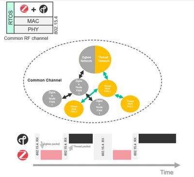 Concurrent Multiprotocol (CMP) technology is a game-changer in the realm of wireless communication, enabling a single chip to operate multiple communication protocols simultaneously. More specifically, this capability is targeted for devices that need to operate in multiple networks and based on the same 802.15.4 standard such as Zigbee and Thread. CMP when combined with concurrent listening ensures that devices can maintain connections with different networks on separate operating channels without the need for multiple radios or switching between protocols. For instance, a single device can communicate with Zigbee and Thread end nodes on different 802.15.4 channels while also switching to Bluetooth (in DMP mode) for user interface interactions.