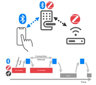 Dynamic Multiprotocol is more fluid and flexible in its ability to swap and can more quickly hop between the two protocols. With dynamic multiprotocol, you do not shutdown or de-initialize the entire protocol stack; instead, you simply keep both running but swap who is using the physical radio, drastically reducing the time to switch. You are sharing the lowest level dependencies between the two protocols, which is typically the radio (this is represented as the bottom brick in the wall in the image below). By being able to swap faster, it allows Bluetooth Low Energy (BLE) connections to remain active, and at the same time remain on the Zigbee/Thread network, by ensuring you remain in the timing windows for each of the protocols as not to drop connection or be removed from the network. This allows the node to respond to either a command via Zigbee/Thread or Bluetooth, which means a user on the phone can control the node and the main network.A good example of a dynamic multiprotocol application is a door lock where you want the user to be able to lock/unlock to door via Bluetooth on their phone, as well as use sensors, time schedule, or cloud command via Zigbee.