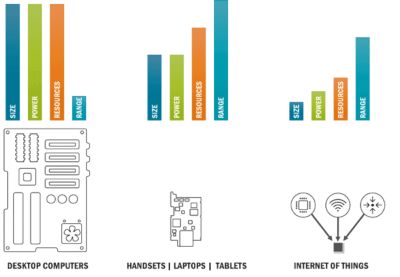 The analyst firm IHS Technology predicts that the IoT will grow to 75.4 billion connected devices by 2025. Such an unprecedented level of connectivity is the result of remarkable advances in technology tracing back to the early 1970s when Intel released the first commercially available microprocessor, the 4004. Ten years later, desktop computing reached the state of the art, ushering in an era of unprecedented personal productivity. Laptop computing emerged in the 1990s and, coincident with expansion of the Internet, marked the beginning of connected mobility. However, it wasn’t until the advent of the smartphone in the mid-2000s did we truly realize an untethered Internet experience. Smartphones put the power of personal computing combined with Internet connectivity in the palms of our hands. Advances in low-power computing, sensing and communication have led to a new class of connected devices. These small, resource-constrained, battery-powered “things” no longer just focus on personal productivity, but rather serve to sense, interact, and automate our surroundings at home, in the workplace, and throughout our urban environments in radically new and useful ways. Figure 1 shows these changes over the evolution of connected devices.